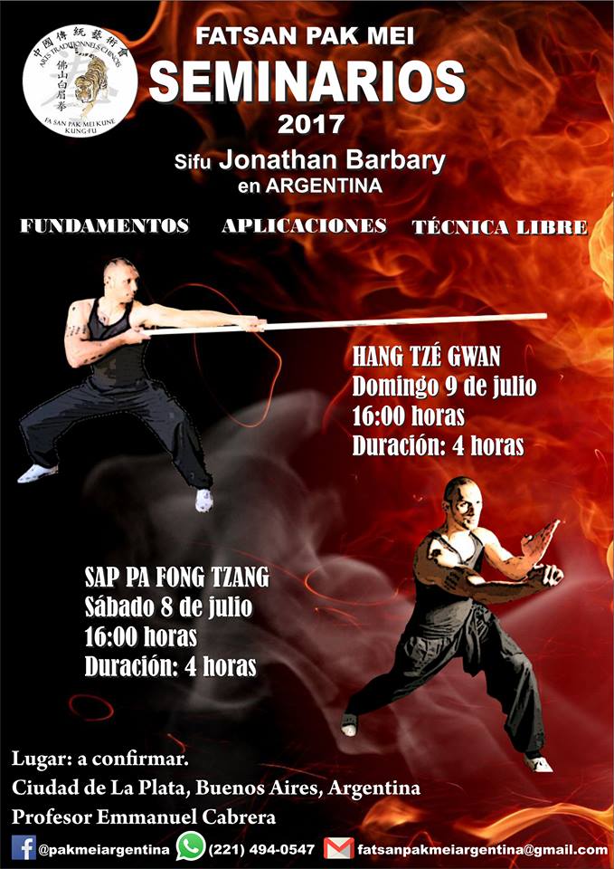 Los días 8 y 9 de julio de 2017 sifu Jonathan Barbary dictó dos seminarios abiertos en La Plata, uno de puño y otro de armas, en sendas jornadas sumamente intensas, en las que, nuevamente, el maestro atrapó la atención de los participantes, no sólo por su acabado conocimiento, sino también por su personalidad y estilo. Así, los alumnos de la Escuela Fatsan Pak Mei, así como de las escuelas amigas, tuvieron una nueva oportunidad de recibir en forma directa, las enseñanzas de sifu Barbary. El mal clima reinante en la oportunidad, con lluvia torrencial, no apagó un ápice el entusiasmo, nada los detuvo. Asistieron las escuelas Xiwang, Chen Bing Taiji Academy La Plata, Lou Wan Gu, Mei Hua, Lung Chi Cheung Argentina, Asociación Zhen Hua, Tao Wu Shu, cuyos Sifus, profesores y alumnos fueron recibidos por la escuela anfitriona, Fatsan Pak Mei.